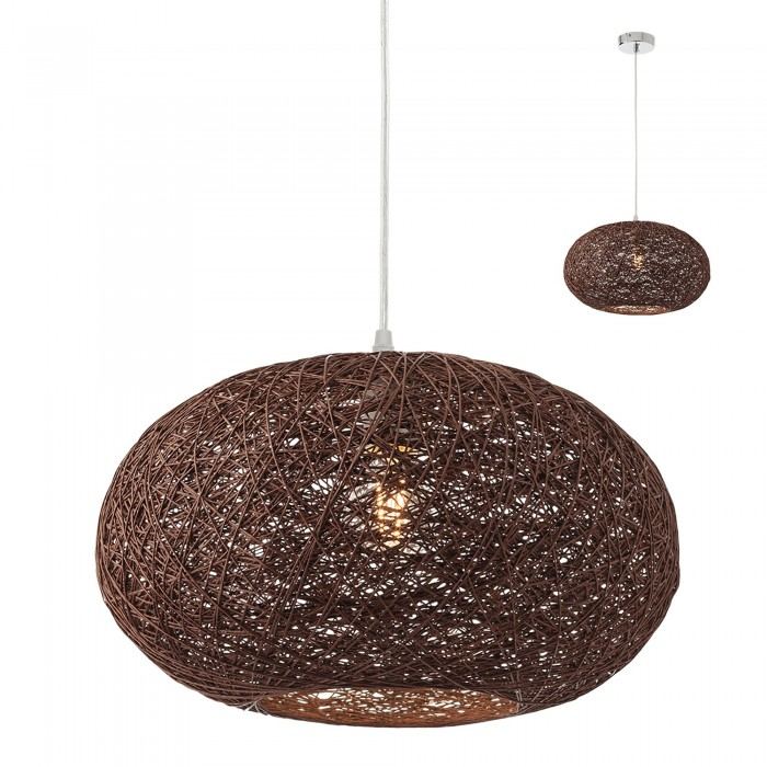 Suspensie modernă pentru interior, structură din metal cromat și dispersor din împletitură din fire de hârtie ignifugă culoare maro inchis.