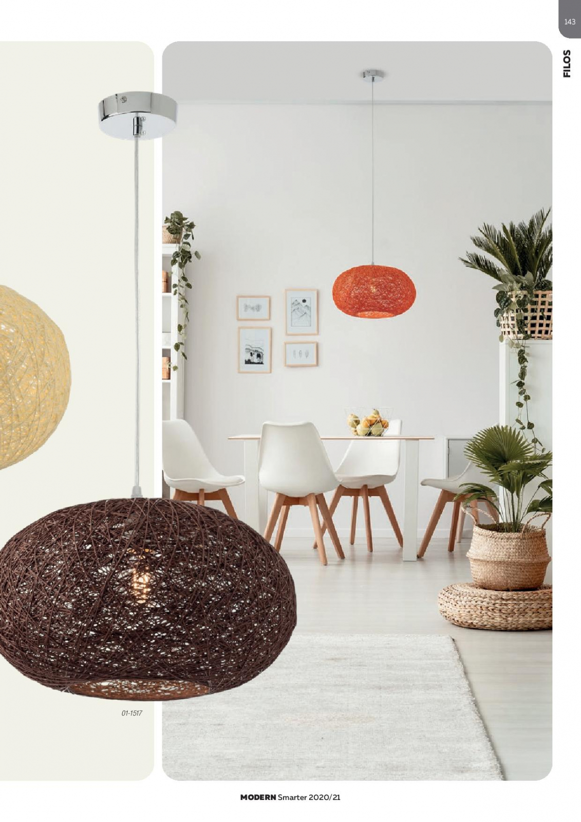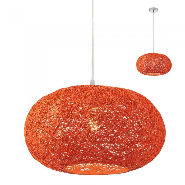 Suspensie modernă pentru interior, structură din metal cromat și dispersor din împletitură din fire de hârtie ignifugă culoare portocalie.